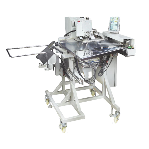 This automated workstation: is mainly used for producing J stitch sewing on jeans, leisure trousers, uniforms, etc. The J stitch pattern can be programmed which can meet the needs for different types of trousers.